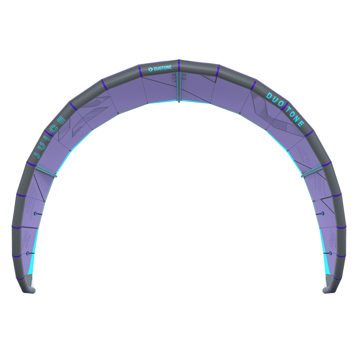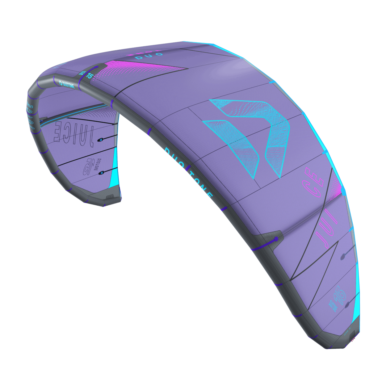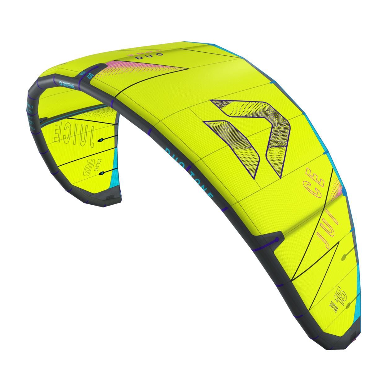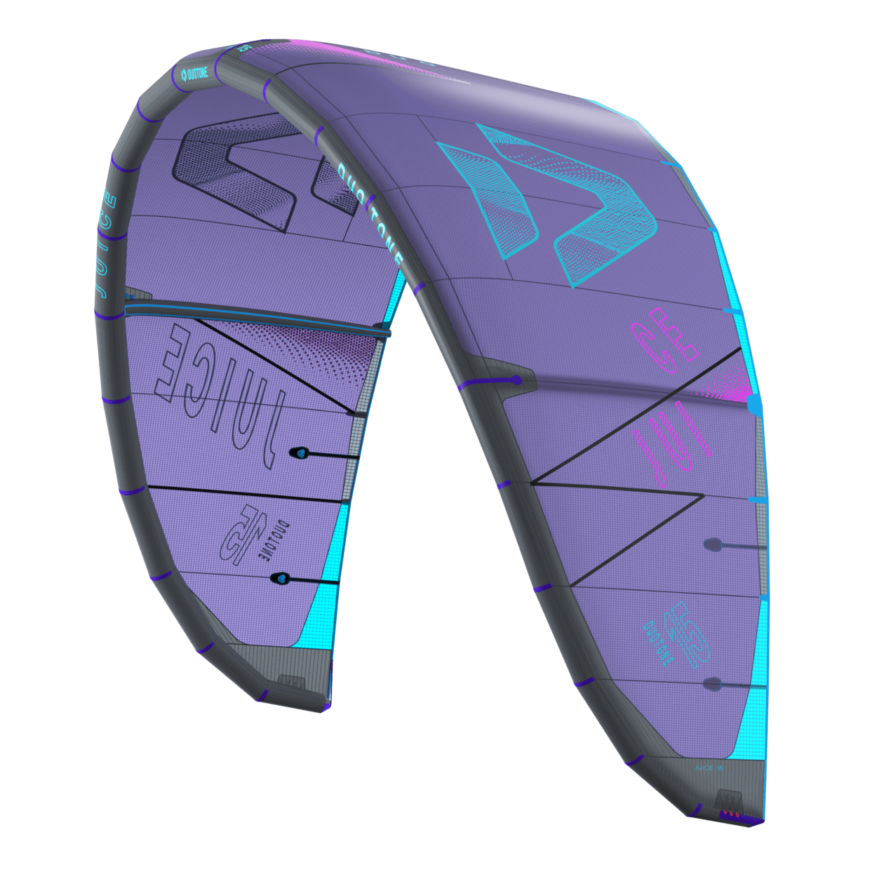 The Duotone Juice offers exceptional lightwind performance through its lightweight construction and meticulous design. Its optimized canopy shape ensures smooth power delivery, allowing you to harness the wind efficiently and start planing early, no matter if on a twintip, a foil or even a surfboard. With top-tier low-end performance, the Juice keeps you riding when others are stranded on the beach. The new design of the Juice sets it apart from its predecessors, boasting increased sweep for more effective water relaunch. The optimized wing tip profile ensures this easy water relaunch even in the lightest conditions, so you can focus on enjoying your session without interruptions. The radical lightwind design of the Juice ensures efficient upwind performance, letting you cover more ground with less effort. To minimize flutter and drag, it incorporates the lightweight batten pocket construction, enhancing the kite's responsiveness and overall smoothness. This light wind weapon now features a refined sweep design, ensuring you can get back up and ride quickly after the kite dropped. This modern redesign emphasizes superior upwind performance, ensuring you can maintain momentum and positioning even in the lightest breezes. With groundbreaking design improvements, this is the easiest Juice to jump with, delivering effortless lift and hang time even when the wind is low. When it comes to lightwind conditions, the Duotone Juice stands unparalleled. Its state-of-the-art design and construction offer you the ability to ride longer, jump higher, and master lightwind sessions with confidence. Whether you're looking to extend your days on the water or maximize your performance in challenging wind conditions, the Duotone Juice is your go-to kite for smooth, powerful, and efficient rides every time. Choose the Duotone Juice and experience the difference of a kite engineered to excel where others fail.